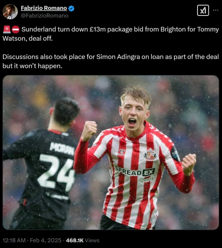 2月4日讯 名记罗马诺消息,布莱顿开出总价1300万英镑的报价(含奖金),求购18岁前锋沃特森,遭到了桑德兰的拒绝。